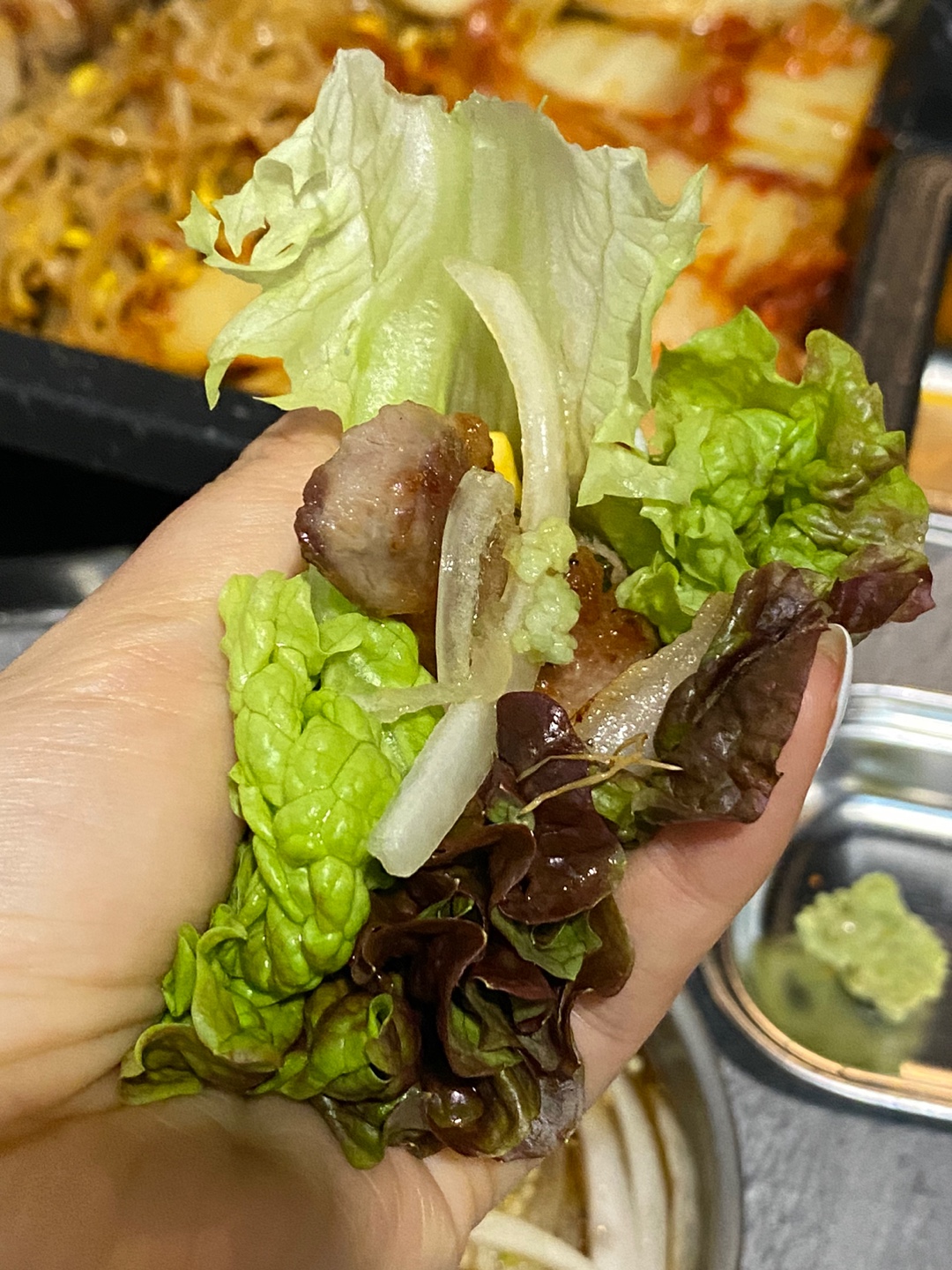 대구 두류동 삼겹살 맛집 답게 고기 질이 좋아서 그런지 엄청 쫀득하고 부드러워서 먹기 좋았습니다. 그냥 먹어도 맛있지만 소금, 와사비, 콩나물, 김치, 팽이버섯, 쌈 등 취향에 맞는 방법으로 먹으면 더 맛있게 먹을 수 있습니다.