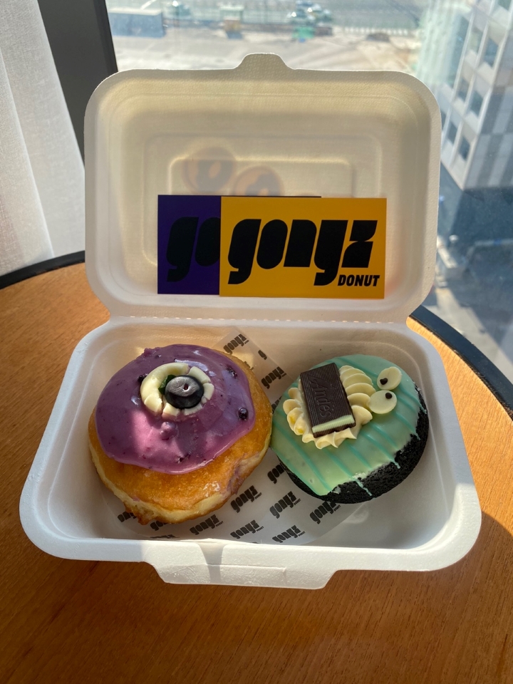 부산 해운대 도넛 맛집답게 먹음직스럽게 보였고 맛은 블루베리 크림치즈 도넛 그리고 민트초코 도넛 이렇게 2가지를 골랐었는데 몇 개 더 살려고 생각했다가 이후 일정이 있어서 다 못 먹을 것 같았는데 열어보니 크기고 괜찮고 맛있어 보였던 것 같고 이쪽저쪽으로 사진을 찍어봤었는데 나중에 확인해보니 역광으로 찍어서 실제보다 사진이 아쉬웠습니다.